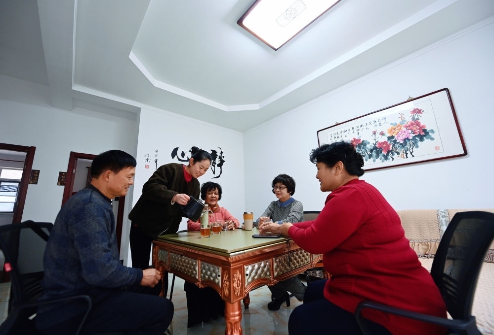 2024年1月30日,在天津市薊州區(qū)下?tīng)I(yíng)鎮(zhèn)前干澗村,民宿經(jīng)營(yíng)者盧桂鳳為游客上茶水。新華社記者 趙子碩 攝