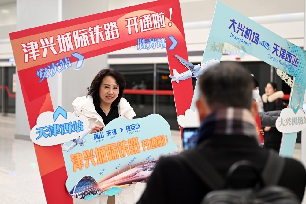 2023年12月18日,旅客在大興機(jī)場(chǎng)站拍照留念。當(dāng)日,津興城際鐵路正式開(kāi)通運(yùn)營(yíng)。新華社記者 李然 攝