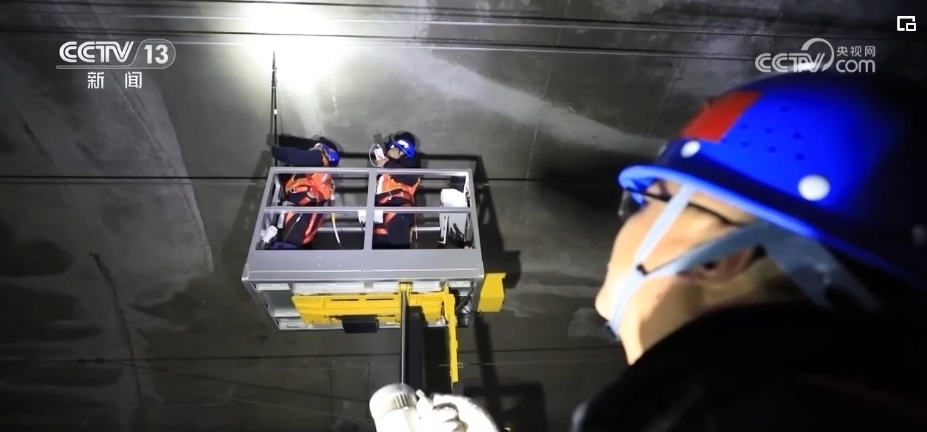 兩個(gè)8米高的作業(yè)平臺(tái),10公斤重的敲擊桿,在與隧道壁的撞擊聲和作業(yè)車的風(fēng)笛聲中,高鐵橋隧工們開(kāi)始了工作。