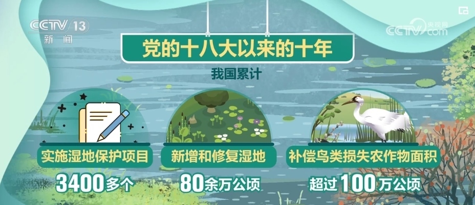 黨的十八大以來的十年,我國累計實施濕地保護項目3400多個,新增和修復濕地80余萬公頃,補償鳥類損失農(nóng)作物面積超過100萬公頃。