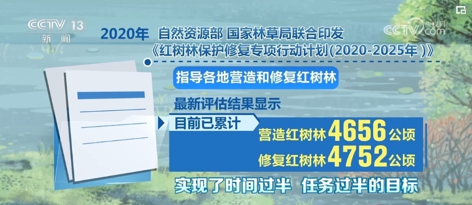 2020年,自然資源部、國家林草局聯(lián)合印發(fā)《紅樹林保護修復專項行動計劃(2020—2025年)》,指導各地營造和修復紅樹林。最新評估結(jié)果顯示,目前,已累計營造紅樹林4656公頃,修復紅樹林4752公頃,實現(xiàn)了時間過半、任務過半的目標。