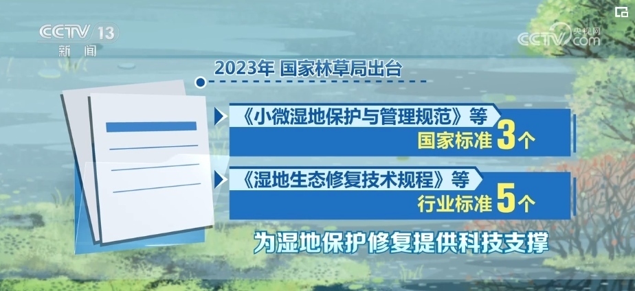 2023年,國家林草局出臺《小微濕地保護與管理規(guī)范》等國家標準3個、《濕地生態(tài)修復技術規(guī)程》等行業(yè)標準5個,為濕地保護修復提供科技支撐。