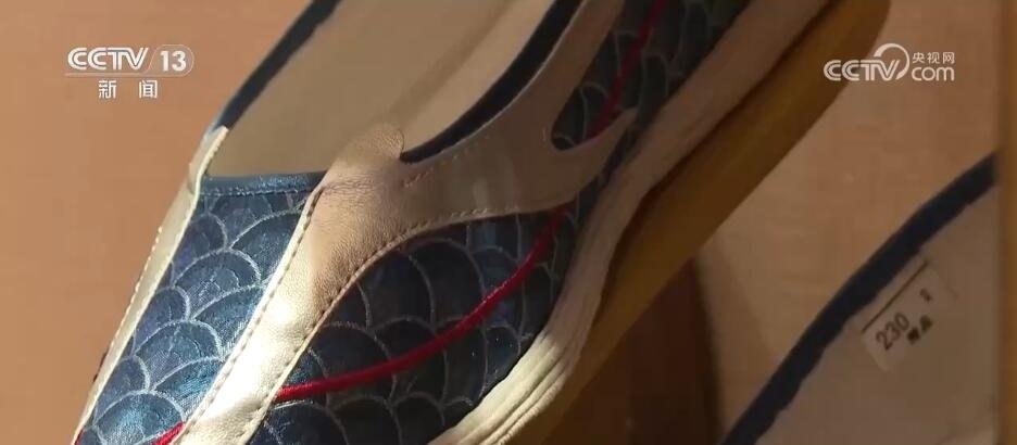 北京內(nèi)聯(lián)升鞋業(yè)有限公司總經(jīng)理 程旭:這款鞋是與《山海經(jīng)》聯(lián)名,它每一片龍的龍鱗是可以打開。這款鞋我們?nèi)ツ旰凸蕦m聯(lián)名推出的一款漢服鞋,你看這個(gè)叫龍角鞋,還有龍的觸角,有龍鱗,還有龍的須子,搭配這種漢服非常別致、非常時(shí)尚。