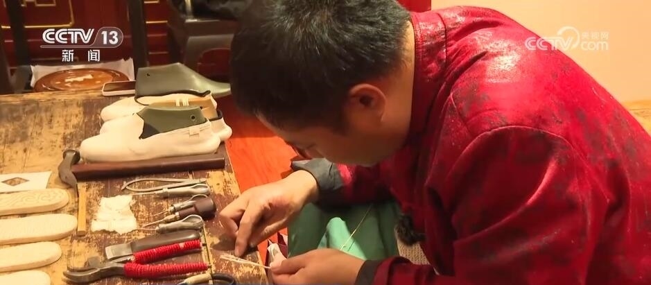 內(nèi)聯(lián)升千層底布鞋制作技藝第五代傳承人 徐文浩:手工納的底用的是一種麻繩,像機(jī)器納底用的就是棉線。這個(gè)麻繩我們也是手工搓出來的,機(jī)器走不了這種不規(guī)矩的線。這個(gè)麻繩在鞋底里整個(gè)會(huì)膨脹,會(huì)把所有的布鎖在一起,咱們穿的時(shí)候,說第一層鞋底磨破了,麻繩都磨斷了,它不會(huì)散,它只會(huì)越磨越薄。像這種機(jī)器納的,這個(gè)線如果說磨斷了,這個(gè)底一層一層就開始脫落了。