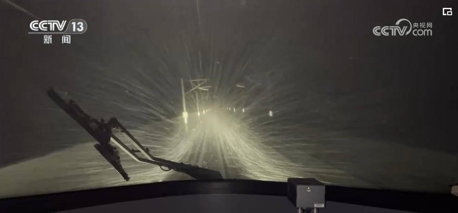 從零時(shí)15分開始到清晨4點(diǎn)多,熱滑除冰車分別駛過鄭州東、黃河大橋、新鄉(xiāng)和南樂,車窗外白雪皚皚,視線和視野都受到限制。一路上,雨滴和雪粒不斷敲打著車窗,從接觸網(wǎng)上掉落的冰碴,不斷落在車頂上砰砰作響,銅基受電弓在結(jié)冰的接觸網(wǎng)上拉出長長的電弧,噼里啪啦電光四射。