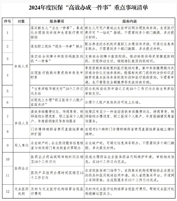 為貫徹落實(shí)《國(guó)務(wù)院關(guān)于進(jìn)一步優(yōu)化政務(wù)服務(wù)提升行政效能推動(dòng)“高效辦成一件事”的指導(dǎo)意見(jiàn)》(國(guó)發(fā)〔2024〕3號(hào),下文簡(jiǎn)稱《指導(dǎo)意見(jiàn)》),精細(xì)化科學(xué)化常態(tài)化優(yōu)化醫(yī)保服務(wù),提高群眾、企業(yè)和醫(yī)藥機(jī)構(gòu)獲得感,國(guó)家醫(yī)療保障局今天(2月9日)發(fā)布關(guān)于在醫(yī)療保障服務(wù)領(lǐng)域推動(dòng)“高效辦成一件事”的通知,著力提供更加便捷高效的醫(yī)療保障服務(wù)。