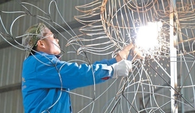 自貢龍騰文化藝術(shù)有限公司生產(chǎn)車間,焊花飛濺,一條中國(guó)龍的骨架正在成形。另一側(cè),裱糊工將龍鱗拼貼上色,彩燈漸顯神韻。
