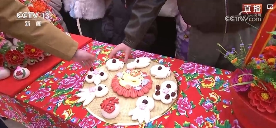 在春節(jié)期間,家家戶戶都會(huì)蒸年饃,每個(gè)年饃都有不同的寓意,花開富貴、步步高升等,龍年特色的花饃非常熱銷。這個(gè)龍型年饃上彩色的元素都是可以食用的,黃色的身子是南瓜汁,藍(lán)色是當(dāng)?shù)匾环N茶葉水調(diào)出來的。