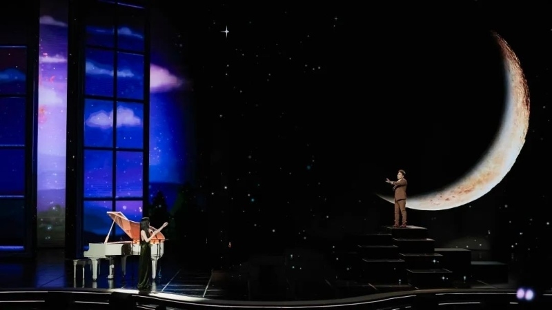 歌詞迅速修改到位,但舞臺的呈現(xiàn)成了讓人反復(fù)琢磨的問題。如何表現(xiàn)“想見卻無法相見”的感覺?如何營造恰到好處的絲絲愁緒?從初次彩排時用秋千承載思念,到二排時改用燈光打造“兩個空間”,幾番嘗試總讓人感覺“還差點兒味道”。最后臺長提議,用“剪影”去暈染思念的情緒,可以考慮用蘇軾的“人有悲歡離合,月有陰晴圓缺”的意境,以月亮為背景。這一下子打開了大家的思路。