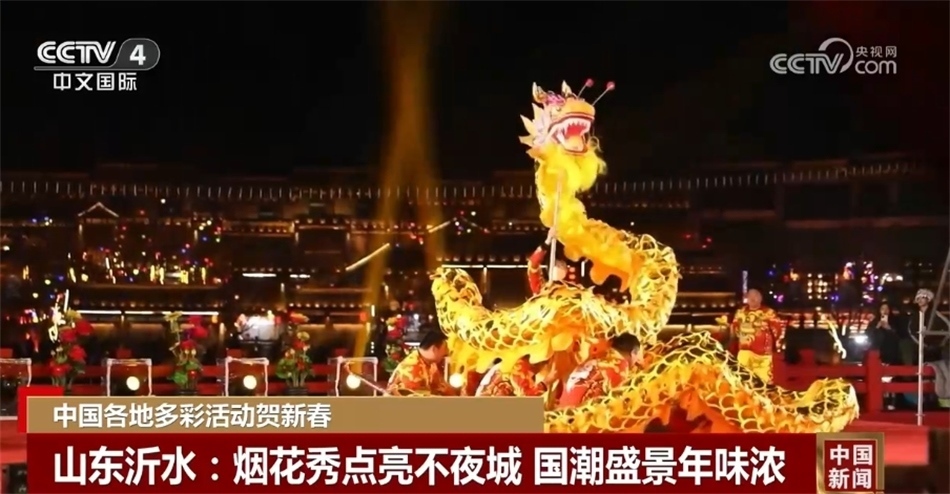 在山東沂水,穿越云端的煙花秀點亮了沂水彩虹不夜城的天空,喧天的鑼鼓、歡騰的舞龍、熱鬧的氣氛搭配著“有鳳來儀”“盛彩敦煌”等隨處可見的國潮盛景,仿佛讓人穿越千年。