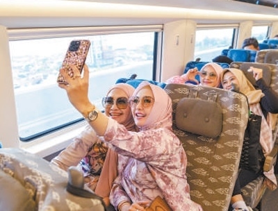 乘客在行駛中的雅萬高鐵車廂內(nèi)拍照。作為“一帶一路”倡議和中印尼兩國務(wù)實(shí)合作的標(biāo)志性項(xiàng)目,雅萬高鐵全線采用中國技術(shù)、中國標(biāo)準(zhǔn)。新華社記者 徐 欽攝