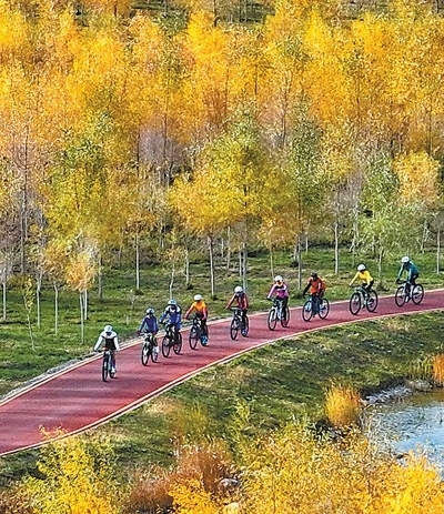 甘肅省張掖市奧林匹克森林公園,騎行愛好者們騎行穿過胡楊林。張掖市推進(jìn)綠化工程,亂石灘“變身”森林公園,成了市民健身休閑的理想之所。王 將攝(影像中國)