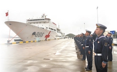 執(zhí)行“和諧使命—2022”任務(wù)的中國海軍“和平方舟”號醫(yī)院船返回浙江舟山某軍港,任務(wù)部隊(duì)官兵代表在碼頭迎接?!昂推椒街邸碧栣t(yī)院船是我國自主設(shè)計(jì)建造的首艘制式遠(yuǎn)洋醫(yī)院船。自2008年入列以來,該船以“和諧使命”任務(wù)為主要載體,多次遠(yuǎn)赴海外開展人道主義醫(yī)療服務(wù)。孫 飛攝(新華社發(fā))