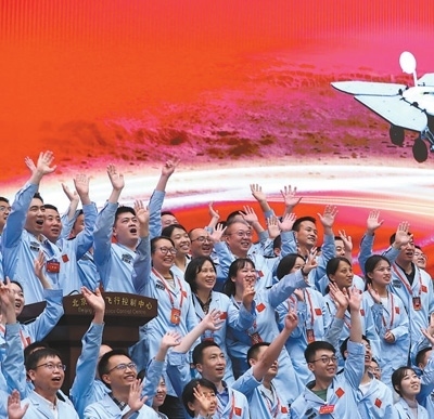 北京航天飛行控制中心青年科技人才群體慶祝我國首次火星探測任務(wù)著陸火星取得成功。目前,我國研發(fā)人才數(shù)量全球第一。新華社記者 金立旺攝
