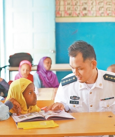 中國人民解放軍駐吉布提保障基地官兵與吉小學(xué)生交流。中國軍隊(duì)在吉布提建設(shè)保障基地,是中吉兩國政府經(jīng)過友好協(xié)商作出的決定,為中國軍隊(duì)執(zhí)行護(hù)航、維和任務(wù)等提供有力保障。30多年來,我國已派出維和人員5萬余人次,赴20多個國家和地區(qū)參加聯(lián)合國維和行動。王宗洋攝(影像中國)