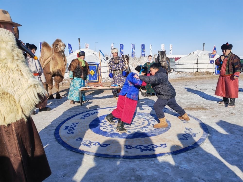 為迎接“十四冬”,呼倫貝爾推出了豐富多彩的文化活動(dòng)和產(chǎn)品。陳巴爾虎旗的牧民巴圖蘇和與合伙人在莫爾格勒河景區(qū)推出“天天冰雪那達(dá)慕”活動(dòng),設(shè)雪地搏克、騎馬射箭、“冰地嘎拉哈”、駱駝爬犁等項(xiàng)目,讓游客沉浸式體驗(yàn)蒙古族文化與傳統(tǒng)運(yùn)動(dòng)。首次嘗試雪地搏克的河北固安游客張瑞堂,與一位蒙古族少年友好競(jìng)技,他的姐姐則用手機(jī)記錄下了這段珍貴的經(jīng)歷。
