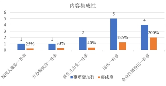 從內(nèi)容集成度看,5項(xiàng)相關(guān)“一件事”的事項(xiàng)集成比例均有不同程度提升?!皻埣踩朔?wù)一件事”增加1個(gè)事項(xiàng),集成度提升25%?!伴_(kāi)辦餐飲店一件事”增加1個(gè)事項(xiàng),集成度提升33%?!靶律鷥撼錾患隆痹黾?個(gè)事項(xiàng),集成度提升40%?!巴诵菀患隆痹黾?個(gè)事項(xiàng),集成度提升125%?!捌髽I(yè)注銷登記一件事”增加4個(gè)事項(xiàng),集成度提升200%。