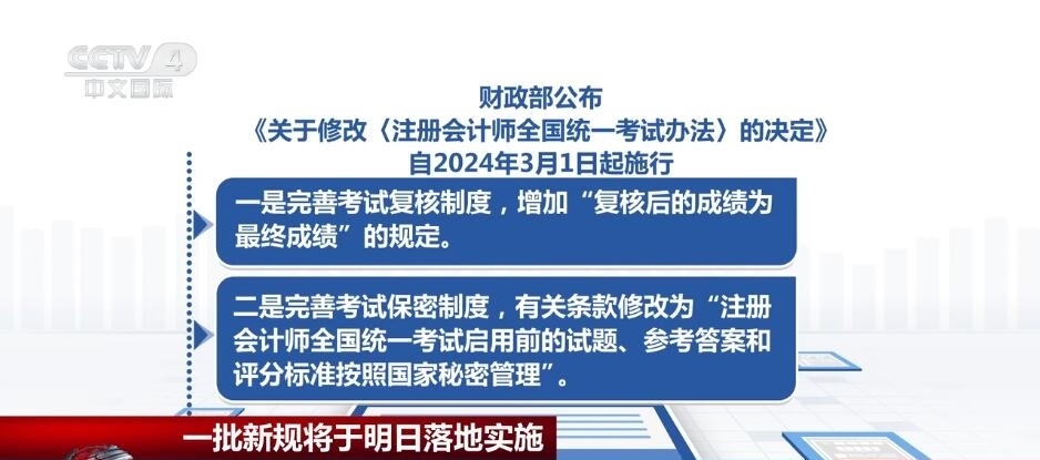 財(cái)政部公布《關(guān)于修改〈注冊會(huì)計(jì)師全國統(tǒng)一考試辦法〉的決定》,自2024年3月1日起施行?!稕Q定》共修改2條。一是完善考試復(fù)核制度,增加“復(fù)核后的成績?yōu)樽罱K成績”的規(guī)定。二是完善考試保密制度,有關(guān)條款修改為“注冊會(huì)計(jì)師全國統(tǒng)一考試啟用前的試題、參考答案和評分標(biāo)準(zhǔn)按照國家秘密管理”。