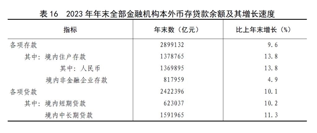 全年社會(huì)融資規(guī)模增量[48]35.6萬億元,按可比口徑計(jì)算,比上年多3.4萬億元。年末社會(huì)融資規(guī)模存量[49]378.1萬億元,按可比口徑計(jì)算,比上年末增長(zhǎng)9.5%,其中對(duì)實(shí)體經(jīng)濟(jì)發(fā)放的人民幣貸款余額235.5萬億元,增長(zhǎng)10.4%。年末全部金融機(jī)構(gòu)本外幣各項(xiàng)存款余額289.9萬億元,比年初增加25.4萬億元,其中人民幣各項(xiàng)存款余額284.3萬億元,增加25.7萬億元。全部金融機(jī)構(gòu)本外幣各項(xiàng)貸款余額242.2萬億元,增加22.2萬億元,其中人民幣各項(xiàng)貸款余額237.6萬億元,增加22.7萬億元。人民幣普惠小微貸款[50]余額29.4萬億元,增加5.6萬億元。人民幣制造業(yè)中長(zhǎng)期貸款余額12.2萬億元,增加3.1萬億元。