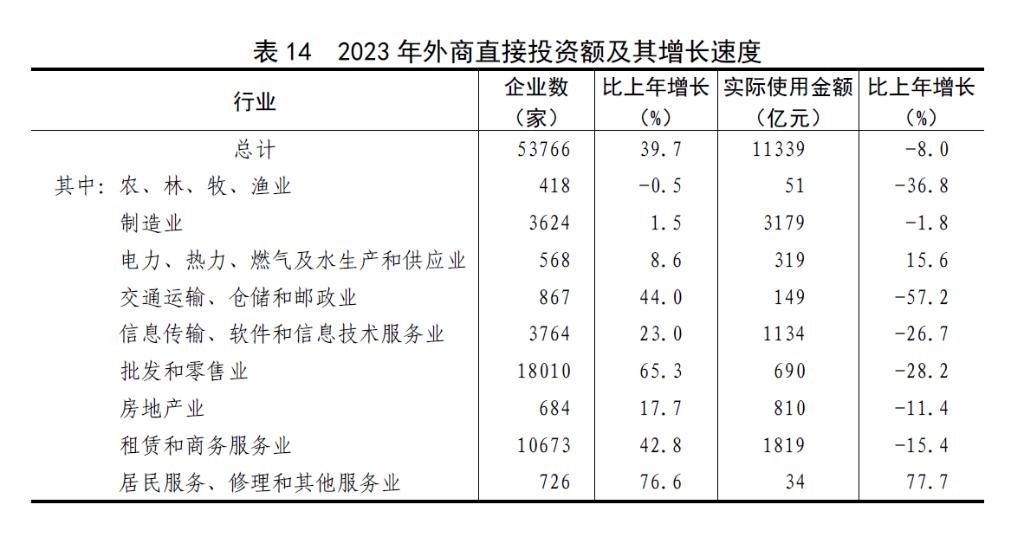 全年外商直接投資新設(shè)立企業(yè)53766家,比上年增長(zhǎng)39.7%。實(shí)際使用外商直接投資額11339億元,下降8.0%,折1633億美元,下降13.7%。其中,共建“一帶一路”國(guó)家對(duì)華直接投資(含通過部分自由港對(duì)華投資)新設(shè)立企業(yè)13649家,增長(zhǎng)82.7%;對(duì)華直接投資額1221億元,下降11.4%,折176億美元,下降16.7%。高技術(shù)產(chǎn)業(yè)實(shí)際使用外資額4233億元,下降4.9%,折610億美元,下降10.8%。