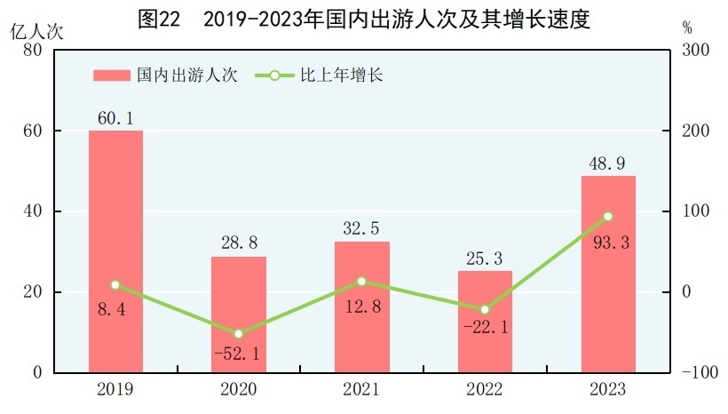 全年國(guó)內(nèi)出游48.9億人次,比上年增長(zhǎng)93.3%。其中,城鎮(zhèn)居民國(guó)內(nèi)出游37.6億人次,增長(zhǎng)94.9%;農(nóng)村居民國(guó)內(nèi)出游11.3億人次,增長(zhǎng)88.5%。國(guó)內(nèi)游客出游總花費(fèi)49133億元,增長(zhǎng)140.3%。其中,城鎮(zhèn)居民出游花費(fèi)41781億元,增長(zhǎng)147.5%;農(nóng)村居民出游花費(fèi)7353億元,增長(zhǎng)106.4%。入境游客8203萬人次,其中外國(guó)人1378萬人次,香港、澳門和臺(tái)灣同胞6824萬人次。入境游客總花費(fèi)530億美元。國(guó)內(nèi)居民出境10096萬人次,其中因私出境9684萬人次,赴港澳臺(tái)出境7704萬人次。