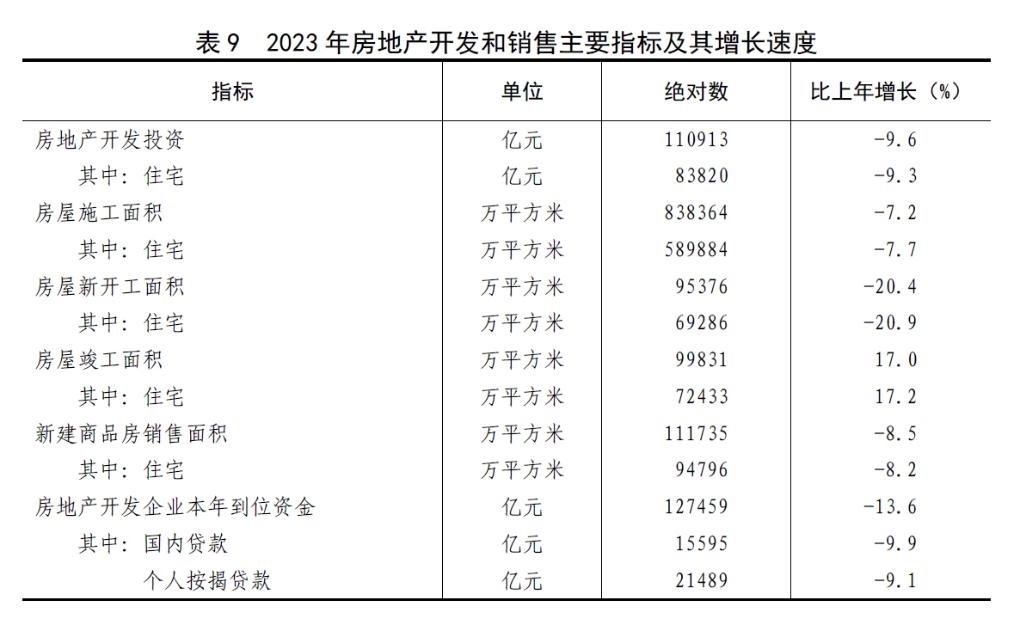 全年房地產(chǎn)開發(fā)投資110913億元,比上年下降[43]9.6%。其中住宅投資83820億元,下降9.3%;辦公樓投資4531億元,下降9.4%;商業(yè)營(yíng)業(yè)用房投資8055億元,下降16.9%。全年新建商品房銷售面積[44]111735萬平方米。二手房交易網(wǎng)簽面積[45]70882萬平方米。年末新建商品房待售面積67295萬平方米,其中商品住宅待售面積33119萬平方米。