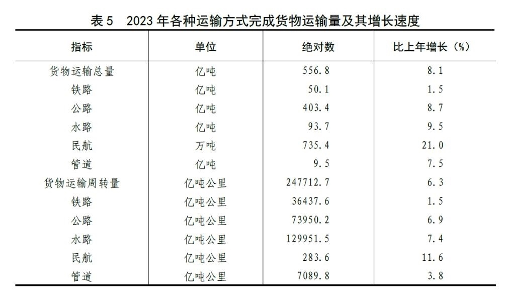 [28]貨物運(yùn)輸總量及周轉(zhuǎn)量包括鐵路、公路、水路、民航和管道五種運(yùn)輸方式完成量,2023年增速按可比口徑計(jì)算。