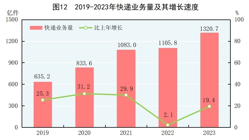 全年完成郵政行業(yè)寄遞業(yè)務(wù)總量[29]1625億件,比上年增長(zhǎng)16.8%。郵政業(yè)完成郵政函件業(yè)務(wù)9.7億件,包裹業(yè)務(wù)0.2億件,快遞業(yè)務(wù)量1320.7億件,快遞業(yè)務(wù)收入12074億元。全年完成電信業(yè)務(wù)總量[30]18327億元,比上年增長(zhǎng)16.8%。年末移動(dòng)電話基站數(shù)[31]1162萬個(gè),其中4G基站629萬個(gè),5G基站338萬個(gè)。全國(guó)電話用戶總數(shù)189992萬戶,其中移動(dòng)電話用戶172660萬戶。移動(dòng)電話普及率為122.5部/百人。固定互聯(lián)網(wǎng)寬帶接入用戶[32]63631萬戶,比上年末增加4666萬戶,其中100M速率及以上的寬帶接入用戶[33]60136萬戶,增加4756萬戶。蜂窩物聯(lián)網(wǎng)終端用戶[34]23.32億戶,增加4.88億戶?;ヂ?lián)網(wǎng)上網(wǎng)人數(shù)10.92億人,其中手機(jī)上網(wǎng)人數(shù)10.91億人?;ヂ?lián)網(wǎng)普及率為77.5%,其中農(nóng)村地區(qū)互聯(lián)網(wǎng)普及率為66.5%。全年移動(dòng)互聯(lián)網(wǎng)用戶接入流量3015億GB,比上年增長(zhǎng)15.2%。軟件和信息技術(shù)服務(wù)業(yè)[35]完成軟件業(yè)務(wù)收入123258億元,比上年增長(zhǎng)13.4%。