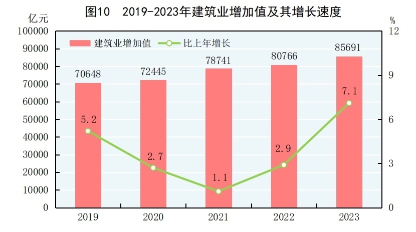 全年建筑業(yè)增加值85691億元,比上年增長(zhǎng)7.1%。全國(guó)具有資質(zhì)等級(jí)的總承包和專業(yè)承包建筑業(yè)企業(yè)利潤(rùn)8326億元,比上年增長(zhǎng)[27]0.2%,其中國(guó)有控股企業(yè)4019億元,增長(zhǎng)4.3%。