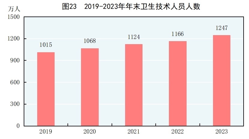 年末全國(guó)共有醫(yī)療衛(wèi)生機(jī)構(gòu)107.1萬個(gè),其中醫(yī)院3.9萬個(gè),在醫(yī)院中有公立醫(yī)院1.2萬個(gè),民營(yíng)醫(yī)院2.7萬個(gè);基層醫(yī)療衛(wèi)生機(jī)構(gòu)101.6萬個(gè),其中鄉(xiāng)鎮(zhèn)衛(wèi)生院3.4萬個(gè),社區(qū)衛(wèi)生服務(wù)中心(站)3.7萬個(gè),門診部(所)36.2萬個(gè),村衛(wèi)生室58.3萬個(gè);專業(yè)公共衛(wèi)生機(jī)構(gòu)1.2萬個(gè),其中疾病預(yù)防控制中心3426個(gè),衛(wèi)生監(jiān)督所(中心)2791個(gè)。衛(wèi)生技術(shù)人員1247萬人,其中執(zhí)業(yè)醫(yī)師和執(zhí)業(yè)助理醫(yī)師478萬人,注冊(cè)護(hù)士563萬人。醫(yī)療衛(wèi)生機(jī)構(gòu)床位1020萬張,其中醫(yī)院800萬張,鄉(xiāng)鎮(zhèn)衛(wèi)生院151萬張。全年總診療人次[75]95.6億人次,出院人次[76]3.0億人次。