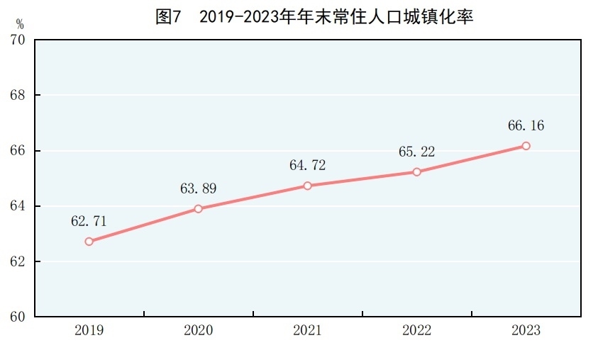 城鄉(xiāng)融合和區(qū)域協(xié)調(diào)發(fā)展步伐穩(wěn)健。年末全國(guó)常住人口城鎮(zhèn)化率為66.16%,比上年末提高0.94個(gè)百分點(diǎn)。分區(qū)域看[20],全年?yáng)|部地區(qū)生產(chǎn)總值652084億元,比上年增長(zhǎng)5.4%;中部地區(qū)生產(chǎn)總值269898億元,增長(zhǎng)4.9%;西部地區(qū)生產(chǎn)總值269325億元,增長(zhǎng)5.5%;東北地區(qū)生產(chǎn)總值59624億元,增長(zhǎng)4.8%。全年京津冀地區(qū)生產(chǎn)總值104442億元,比上年增長(zhǎng)5.1%;長(zhǎng)江經(jīng)濟(jì)帶地區(qū)生產(chǎn)總值584274億元,增長(zhǎng)5.5%;長(zhǎng)江三角洲地區(qū)生產(chǎn)總值305045億元,增長(zhǎng)5.7%。粵港澳大灣區(qū)建設(shè)、黃河流域生態(tài)保護(hù)和高質(zhì)量發(fā)展等區(qū)域重大戰(zhàn)略深入推進(jìn)。