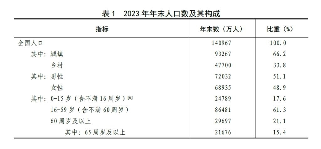 [6]2023年年末,0-14歲(含不滿15周歲)人口為23063萬人,15-59歲(含不滿60周歲)人口為88207萬人。
