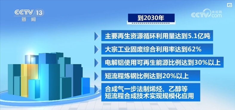 《指導意見》提出,到2030年,主要再生資源循環(huán)利用量達到5.1億噸,大宗工業(yè)固廢綜合利用率達到62%,電解鋁使用可再生能源比例達到30%以上,短流程煉鋼比例達到20%以上,合成氣一步法制烯烴、乙醇等短流程合成技術實現(xiàn)規(guī)?;瘧谩?br>