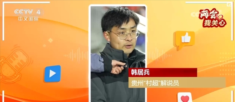 貴州“村超”解說(shuō)員韓居兵表示他從小接觸到足球,看到前輩們踢球,現(xiàn)在有了“村超”,所以喜歡上了足球。