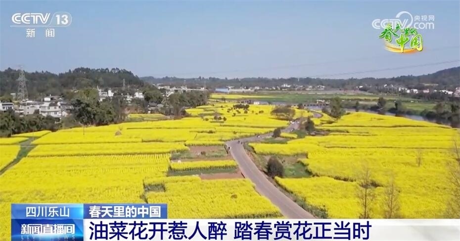 遠(yuǎn)眺峨眉山,近看峨眉河,萬頃金波花如海,流金溢彩百里香。現(xiàn)在我們看到的是四川樂山市中區(qū) 永和村的近千畝油菜花,在陽光照射下,猶如斑斕的綢帶,妝點(diǎn)了峨眉河沿岸五彩的山色春光。趁著晴好天氣,市民、游客來到戶外踏青賞景,在花田中徜徉流連,感受春日美好時(shí)光。