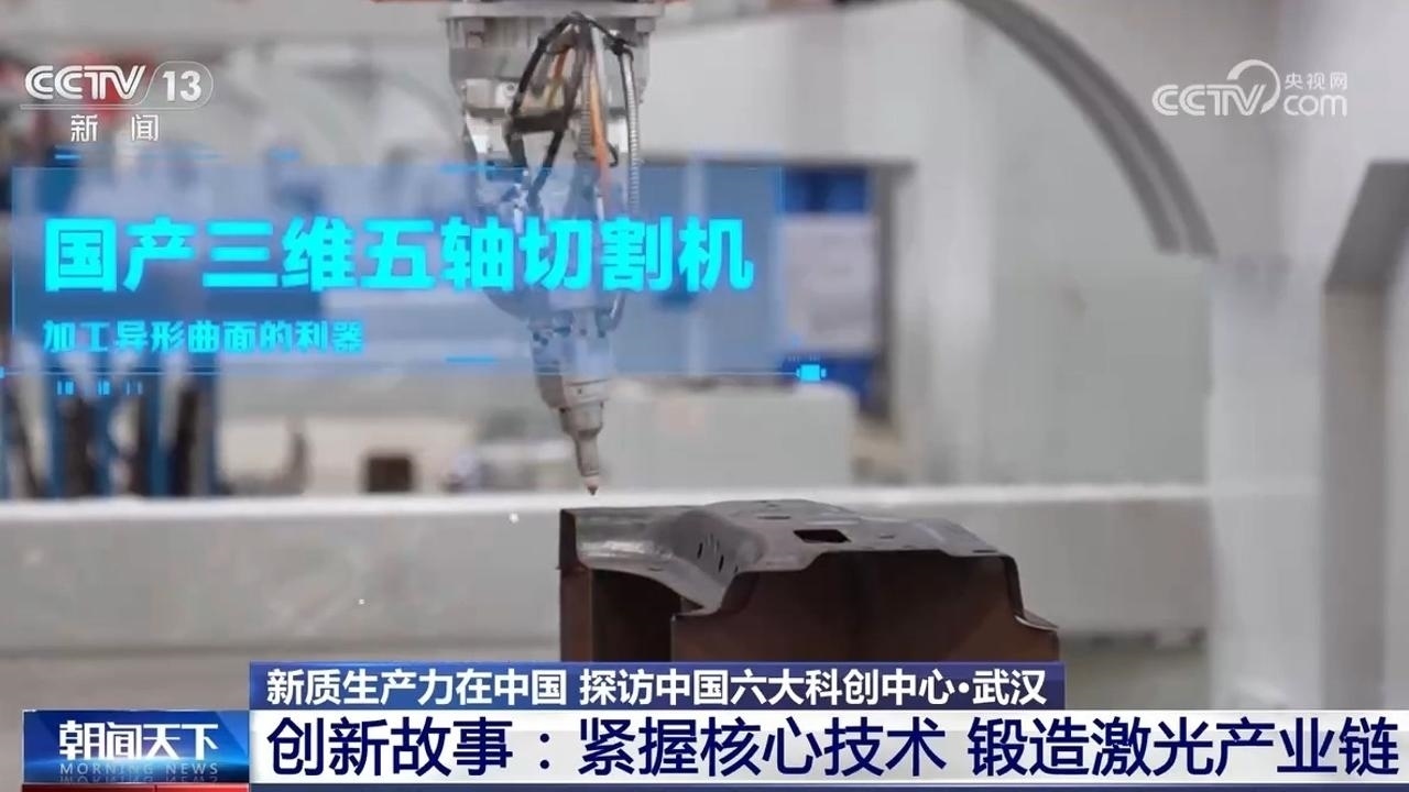 這是一臺國產(chǎn)三維五軸激光切割機,它是加工異形曲面零部件的利器,代表著目前全球激光數(shù)控機床最高的技術(shù)水平。它的三維五軸切割頭由華工科技開發(fā),數(shù)控系統(tǒng)由華中數(shù)控打造,激光器由銳科激光提供。借助國家智能設(shè)計與數(shù)控技術(shù)創(chuàng)新中心這個國家級的創(chuàng)新平臺,在一條產(chǎn)線上,華工科技與產(chǎn)業(yè)鏈上下游多企業(yè)協(xié)同創(chuàng)新,實現(xiàn)了產(chǎn)業(yè)鏈的深度融合。?