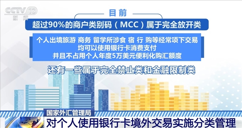 根據(jù)規(guī)定,目前,超過(guò)90%的商戶(hù)類(lèi)別碼屬于完全放開(kāi)類(lèi),個(gè)人出境旅游、商務(wù)、留學(xué)所涉食、宿、行、購(gòu)等經(jīng)常項(xiàng)下交易,均可以使用銀行卡消費(fèi)支付,并且不占用個(gè)人年度5萬(wàn)美元便利化購(gòu)匯額度。此外,還有一些屬于完全禁止類(lèi)和金融限制類(lèi)。