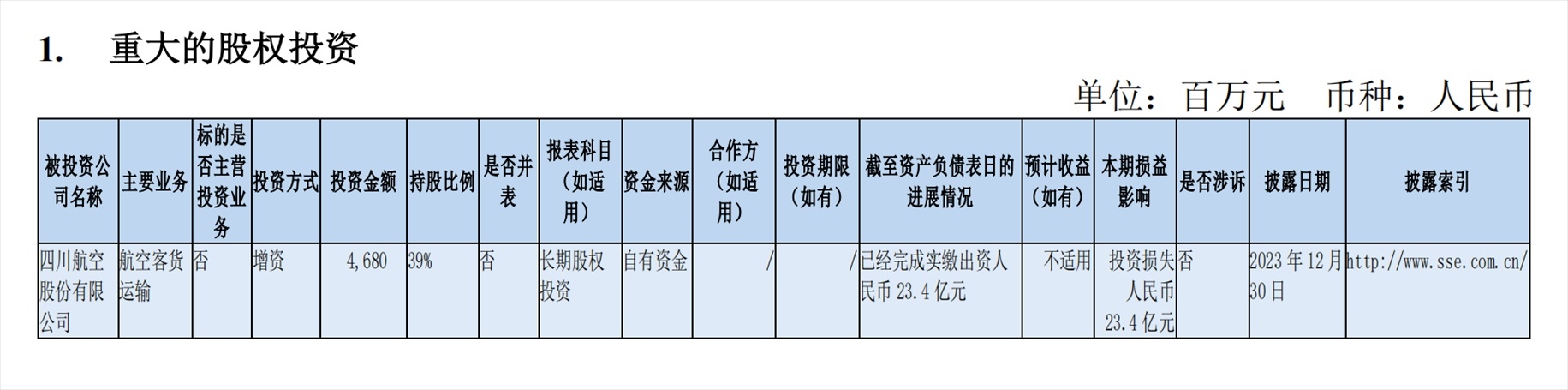 南方航空副董事長(zhǎng)、總經(jīng)理韓文勝在3月29日的業(yè)績(jī)說(shuō)明會(huì)上也提到,四川航空前期未確認(rèn)的損失自2021年6月開(kāi)始形成,截至2023年12月31日增資當(dāng)期,確認(rèn)虧損23.4億元,尚未確認(rèn)26.6億元。投資損失產(chǎn)生的原因主要是疫情期間四川航空累計(jì)經(jīng)營(yíng)虧損,超出南航對(duì)四川航空的投資成本。