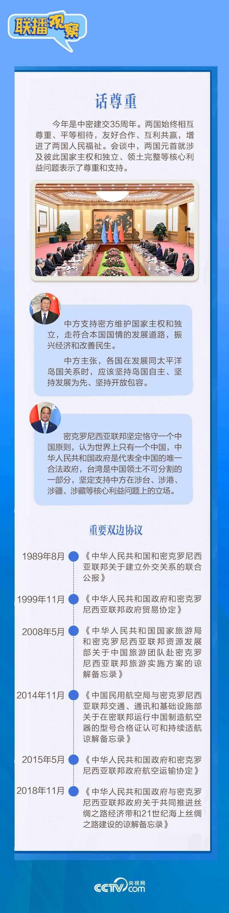 應(yīng)習(xí)近平主席邀請(qǐng),密克羅尼西亞聯(lián)邦總統(tǒng)韋斯利·西米納于4月5日至12日對(duì)中國進(jìn)行國事訪問。4月9日下午,習(xí)近平主席在北京人民大會(huì)堂同西米納總統(tǒng)舉行會(huì)談,就雙邊關(guān)系發(fā)展及共同關(guān)心的問題深入交換意見。雙方會(huì)談哪些細(xì)節(jié)值得關(guān)注?央視網(wǎng)《聯(lián)播觀察》帶您了解。
