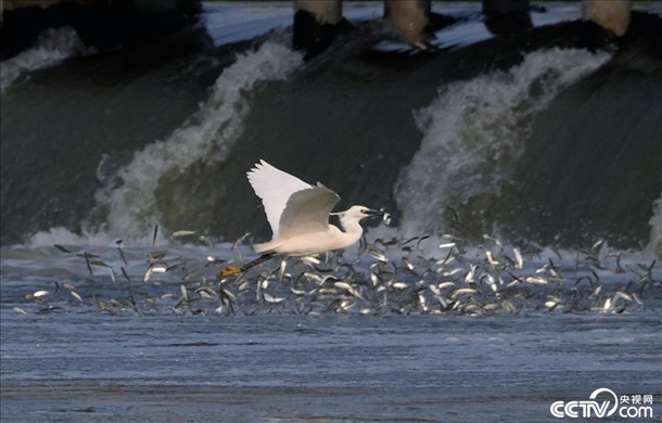 2024年4月9日,南京,秦淮河入江口,白鷺?biāo)姹P旋,捕食江中小魚。