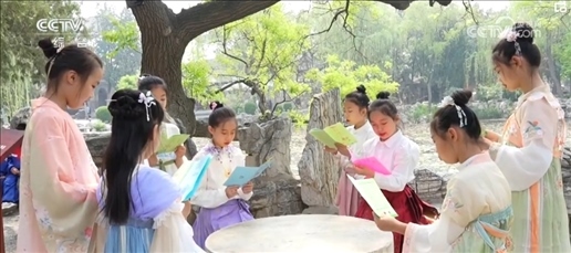 在江西南昌、河北保定,小學(xué)生們踴躍分享讀書心得。大家還走出教室,來(lái)到林蔭下、池塘邊,沉浸式誦讀經(jīng)典古詩(shī)詞。