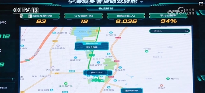 當(dāng)這些打包好的快遞包裹袋上車后,公交車上的大屏幕內(nèi)置讀卡器感應(yīng)到包裹袋上的二維碼,遠(yuǎn)在32公里之外的寧海客貨郵智控管理中心內(nèi),包裹實(shí)時(shí)信息和公交車運(yùn)行軌跡都出現(xiàn)在了大屏幕上。