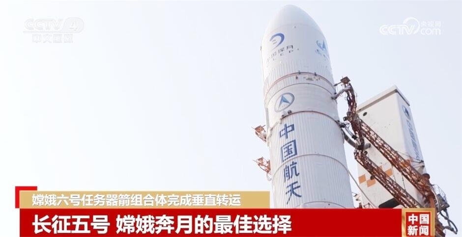 4月27日,在中國文昌航天發(fā)射場,嫦娥六號探測器和長征五號遙八運載火箭器箭組合體垂直轉運至發(fā)射區(qū),計劃于5月初擇機發(fā)射。