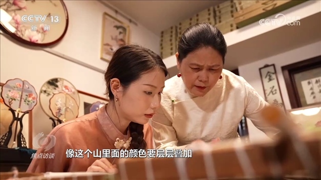 盧建英是蘇州當(dāng)?shù)赜忻奶K繡代表性傳承人。記者見到她的時候,她正在指導(dǎo)女兒刺繡。