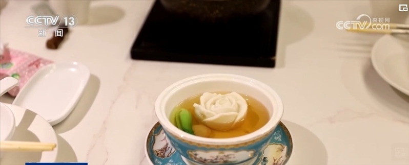 不僅僅是氛圍的打造,菜品創(chuàng)意也在還原原著中十二道菜品的基礎(chǔ)上,再對(duì)其進(jìn)行創(chuàng)新和延伸, “可卿山藥棗泥糕”“鳳姐火腿肘子”“寶釵胭脂鵝”等獨(dú)具紅樓特色的菜品,都可以在這里吃到。這朵以假亂真的花朵是這里的一道招牌菜,由魚茸制作而成的“黛玉傳花”,來(lái)自上海的房阿姨對(duì)這道菜尤為喜愛(ài)。