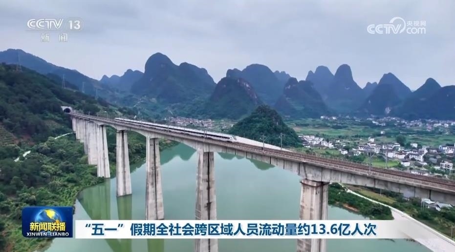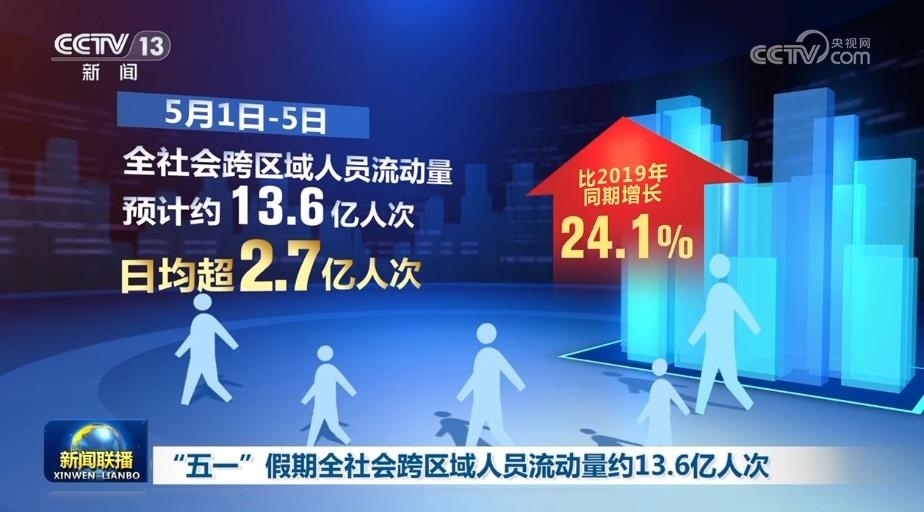 初步統(tǒng)計(jì)顯示,5月1日—5日,全社會(huì)跨區(qū)域人員流動(dòng)量預(yù)計(jì)約13.6億人次,日均超2.7億人次,比2019年同期增長(zhǎng)24.1%。
