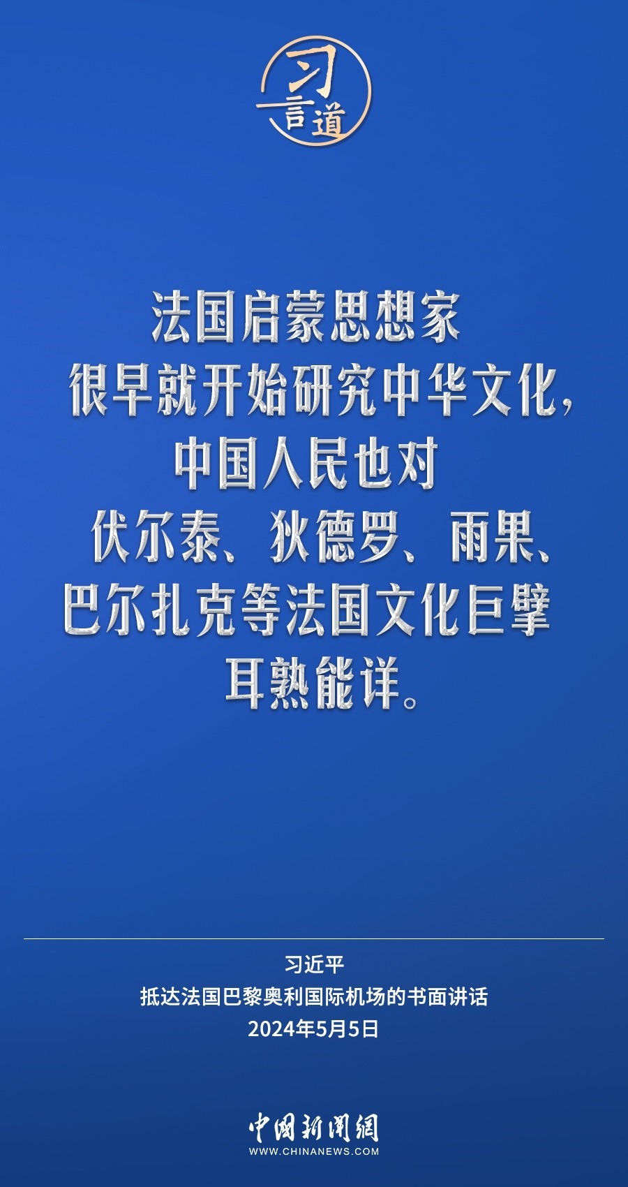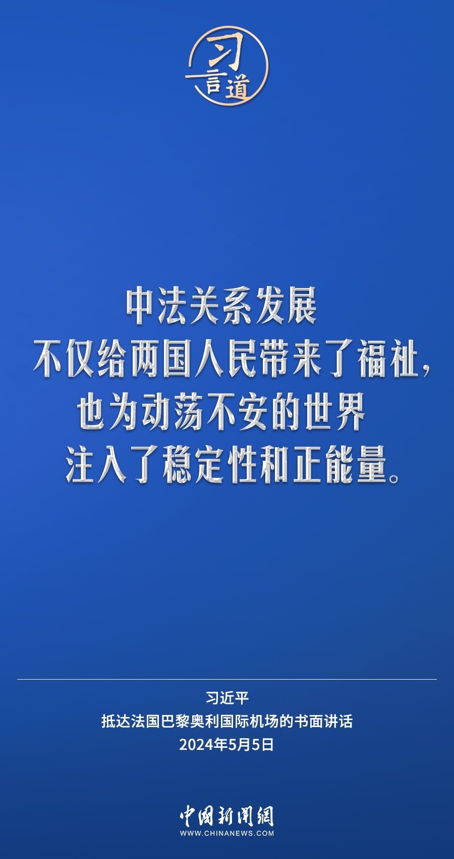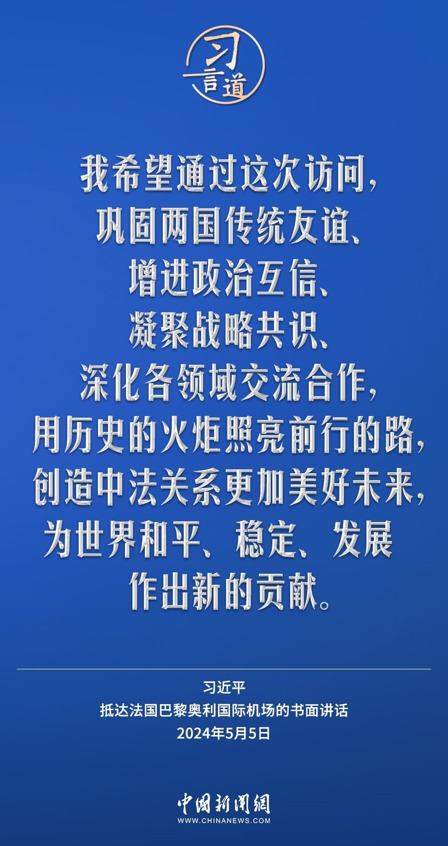 當(dāng)?shù)貢r(shí)間5月5日下午,國(guó)家主席習(xí)近平抵達(dá)巴黎,開(kāi)始對(duì)法國(guó)進(jìn)行國(guó)事訪(fǎng)問(wèn)。在抵達(dá)法國(guó)巴黎奧利國(guó)際機(jī)場(chǎng)的書(shū)面講話(huà)中,習(xí)近平指出——