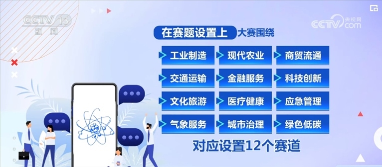 在賽題設(shè)置上,大賽圍繞工業(yè)制造、現(xiàn)代農(nóng)業(yè)、商貿(mào)流通、交通運輸、金融服務(wù)、科技創(chuàng)新、文化旅游、醫(yī)療健康、應急管理、氣象服務(wù)、城市治理、綠色低碳12個行業(yè)及領(lǐng)域,對應設(shè)置12個賽道。