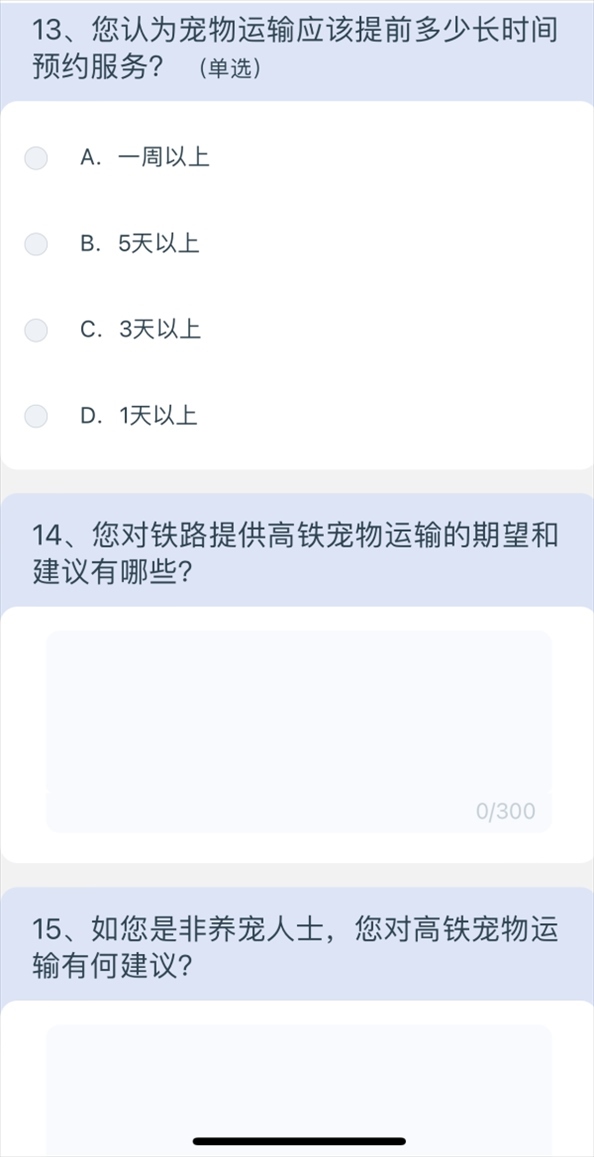 5月10日上午8點40分,澎湃新聞記者通過掃描網(wǎng)友分享的列車上的二維碼,進入12306系統(tǒng),選擇問卷·建議,進入“鐵路旅客高鐵寵物運輸”調(diào)查,共15個問題,涉及養(yǎng)寵類型、是否有攜帶寵物出行的需求、如果鐵路提供寵物運輸服務(wù)是否愿意嘗試等,以及為降低對其他旅客的影響,在高鐵寵物運輸更關(guān)注哪方面的防護;如鐵路提供高鐵寵物運輸服務(wù),期望的定價標(biāo)準(zhǔn);如鐵路提供高鐵寵物運輸服務(wù),最關(guān)注的內(nèi)容;如果是非養(yǎng)寵人士,對高鐵寵物運輸有何建議等多方面問題。
