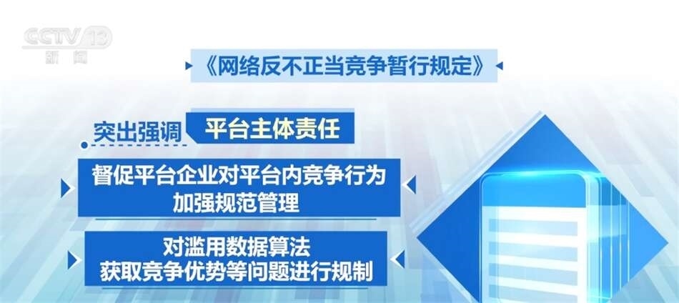 平臺企業(yè)掌握海量數(shù)據(jù),連接大量主體,既是網(wǎng)絡(luò)不正當(dāng)競爭監(jiān)管的重點(diǎn)對象,也是協(xié)同監(jiān)管的關(guān)鍵節(jié)點(diǎn)?!兑?guī)定》突出強(qiáng)調(diào)了平臺主體責(zé)任,督促平臺企業(yè)對平臺內(nèi)競爭行為加強(qiáng)規(guī)范管理,同時(shí)對濫用數(shù)據(jù)算法獲取競爭優(yōu)勢等問題進(jìn)行規(guī)制。